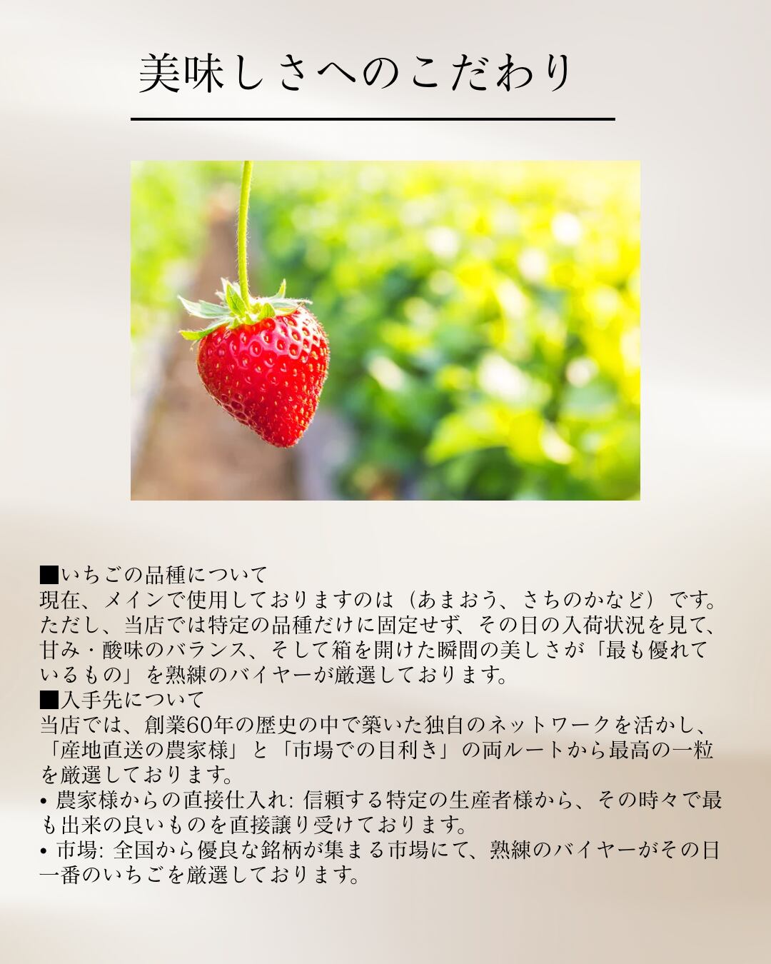 品種名に甘んじることなく、その日の気温や入荷状況から「今、一番美味しい状態」のいちごだけをプロの目で選び抜きます。発送当日の朝に再検品し、最高の個体だけをその場でパッキング。市場直送の瑞々しさをそのままお届けします。