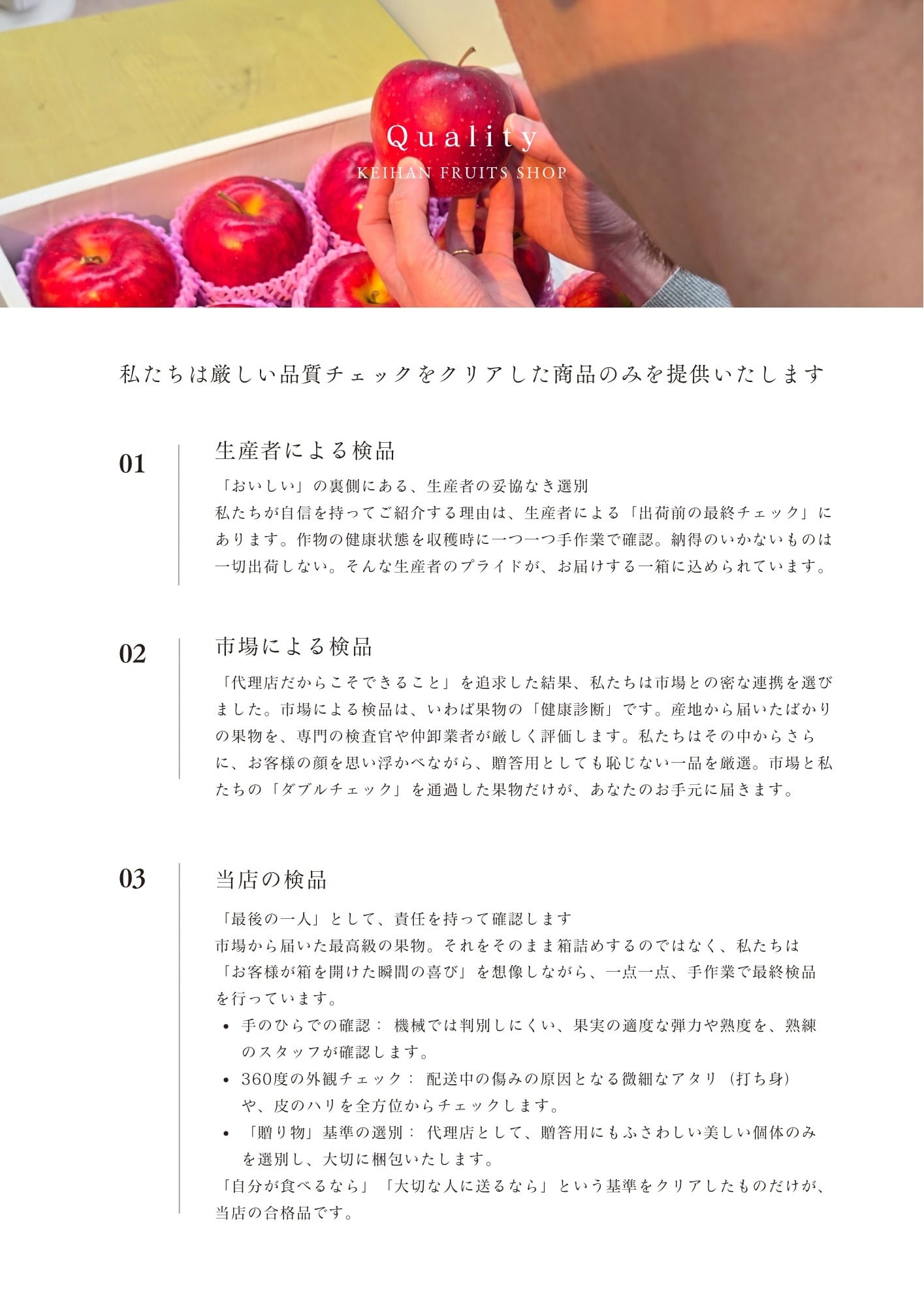 • 旬のフルーツ: 甘みと鮮度にこだわった、厳選フルーツを詰め合わせ。