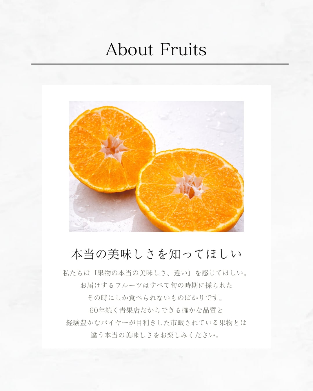 • 旬のフルーツ: 甘みと鮮度にこだわった、厳選みかんの詰め合わせ。
