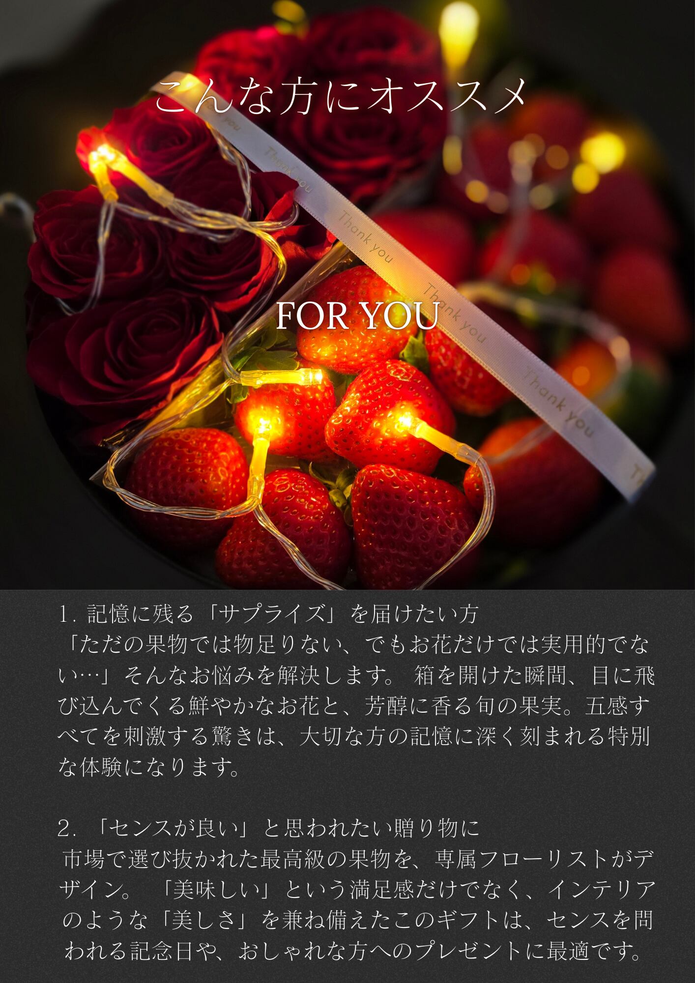 箱を開けた瞬間に広がるフレッシュな花の香りと、宝石のように輝く旬のフルーツ。視覚・嗅覚・そして味覚。五感すべてを満足させる、究極の「体験型ギフト」です。