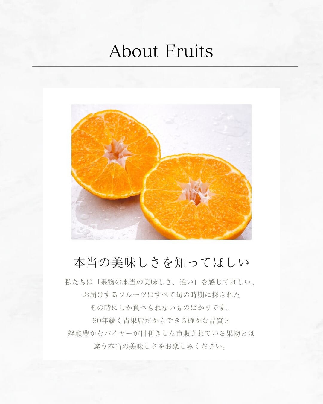 • 旬のフルーツ: 甘みと鮮度にこだわった、厳選みかんの詰め合わせ。