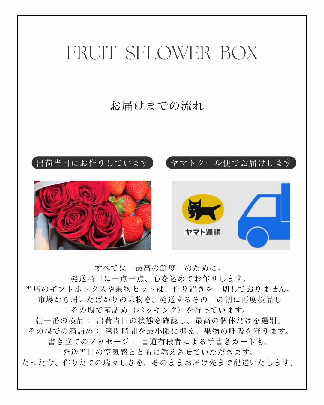 そんな贈り主様の優しい想いを形にするために、独自の感性で季節の花々と瑞々しいフルーツを贅沢に詰め合わせた、当店だけの特別なギフトボックスです。